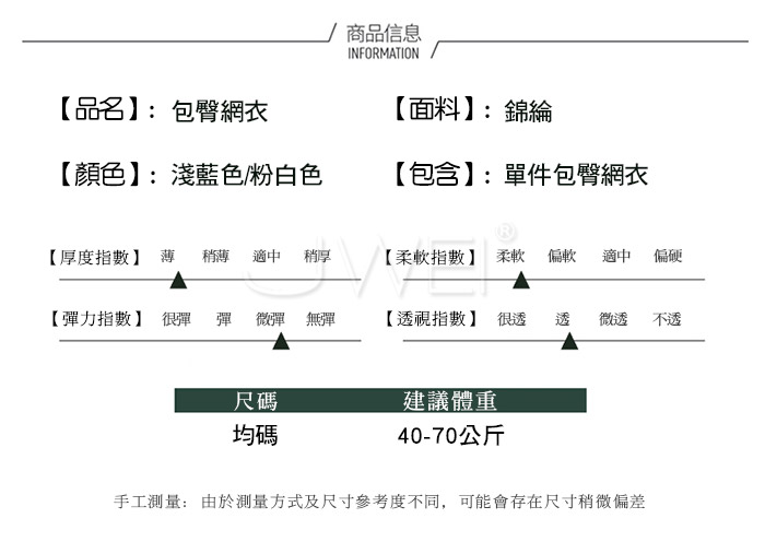 ■內容物:單件網衣 ■適穿尺寸:FREESIZE ■彈性:有 ■未撐開平量尺寸正負誤差1~2cm,1吋=2.54cm ■注意事項:基於保障消費者個人衛生,此貼身衣物恕不接受退換貨。 (如為商品本身暇疵,接受七日內換貨,請勿試穿,謝謝您)