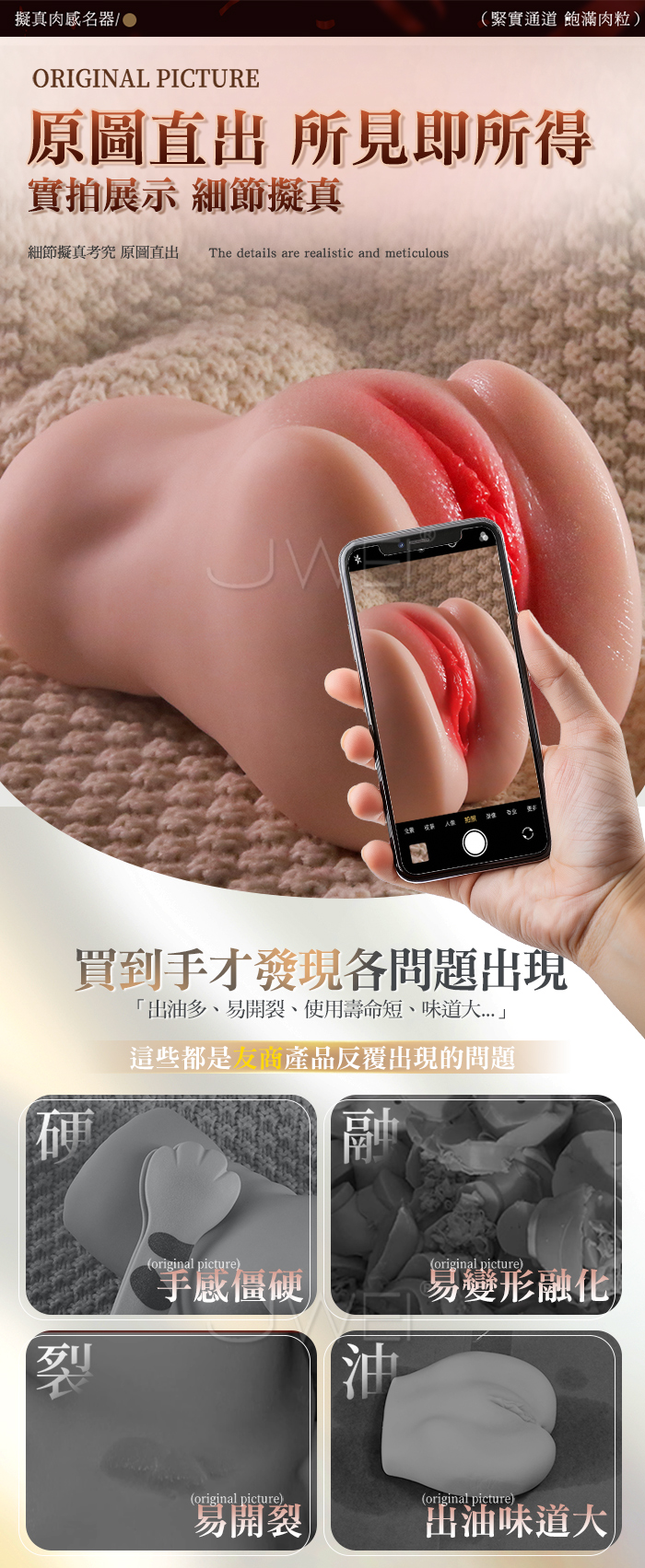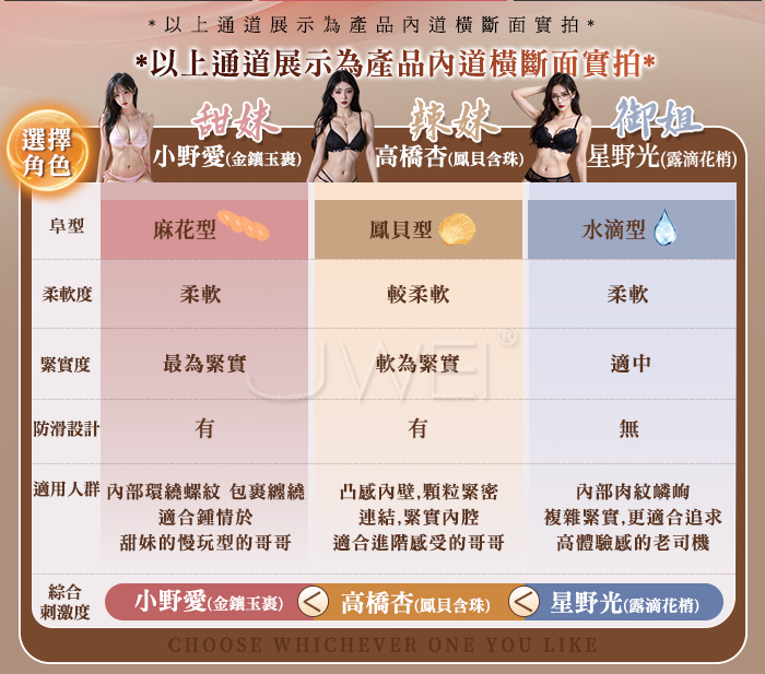 擬真複製 肉感三姐妹,三款美女&體驗升級,肌膚紋理都能看見! 緊實大肉粒群肉感通道,包裹纏繞 滿足肉慾 高性價比 柔軟手感 擬真觸感,觸感柔嫩有彈性 體驗更好 產品規格 ■尺寸:大小詳如圖片標示 ■材質:TPE ■重量:高橋杏約925g、小野愛約952g、星野光約796g