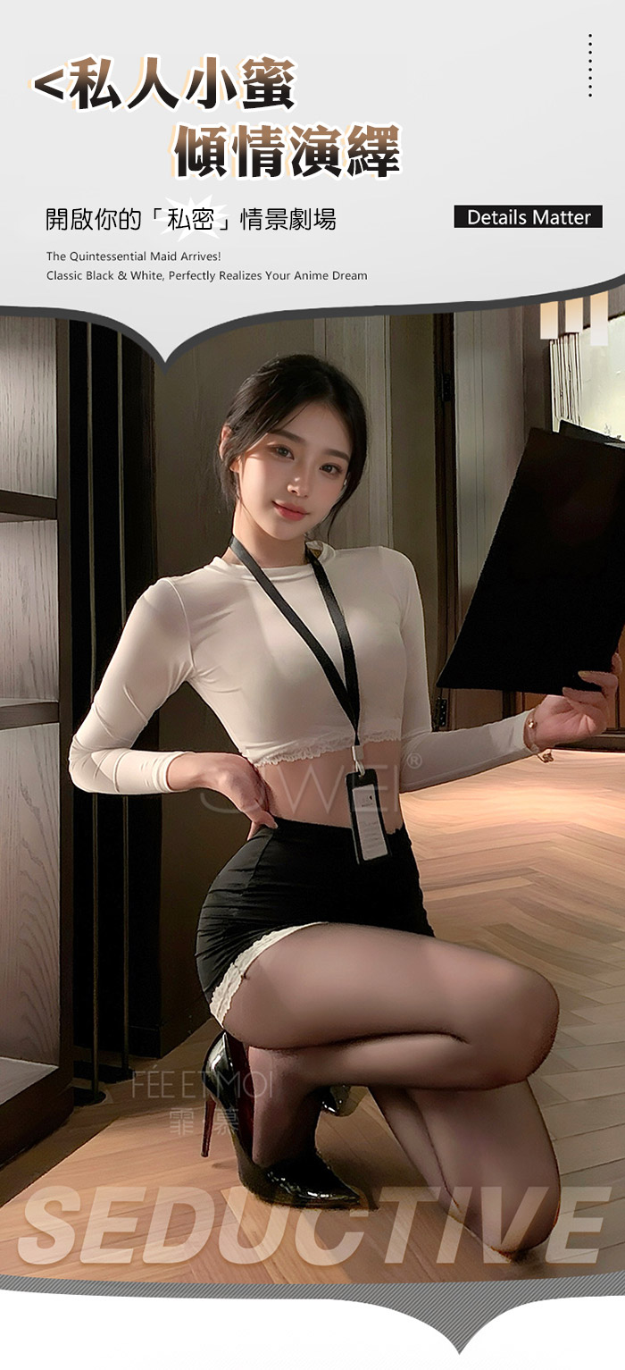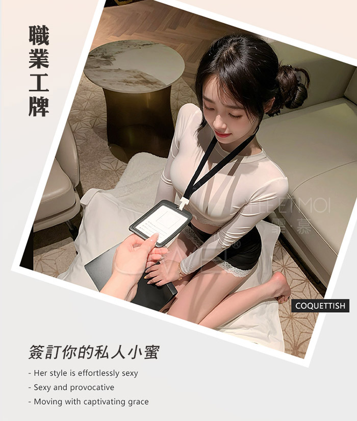 首頁>職場佳麗.撩撥暗慾腰腹雙邊蕾絲秘書套裝【上衣+工牌+包臀裙】