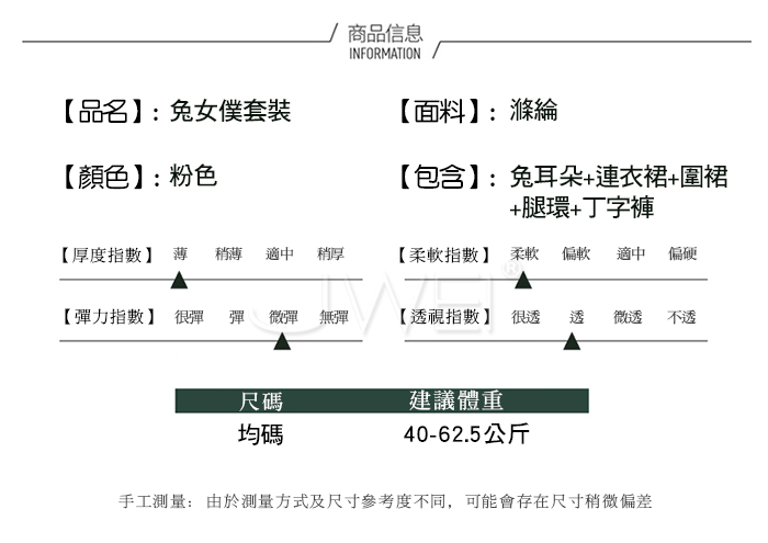 ■內容物:兔耳朵+連衣裙+圍裙+腿環+丁字褲 ■適穿尺寸:FREESIZE ■彈性:有 ■未撐開平量尺寸正負誤差1~2cm,1吋=2.54cm ■注意事項:基於保障消費者個人衛生,此貼身衣物恕不接受退換貨。 (如為商品本身暇疵,接受七日內換貨,請勿試穿,謝謝您)