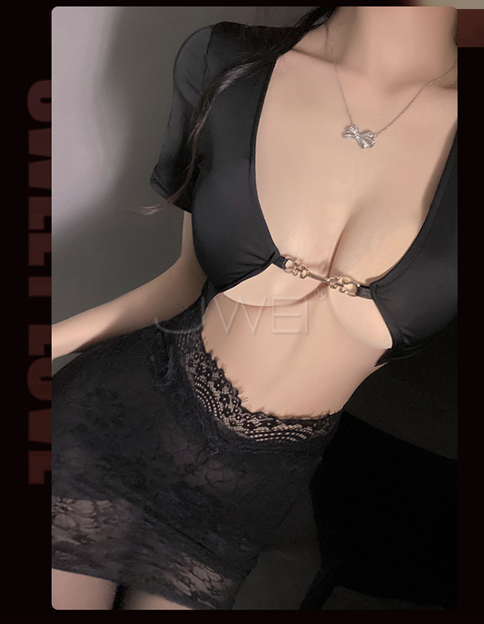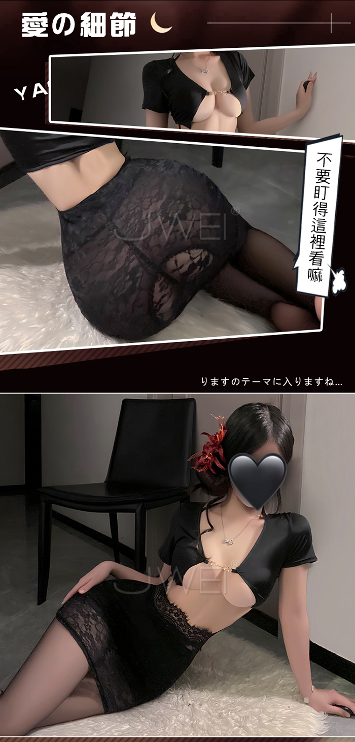 ►您現在的位置:首頁>禁欲之花.性感開胸露乳花蔓蕾絲透膚包臀輕熟秘書裝【短上衣+連身裙+T褲】