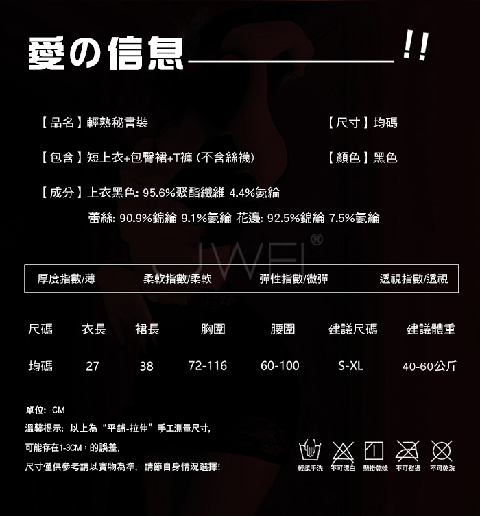 2.基於保障消費者個人衛生,情趣衣物類恕不接受退換貨,如為商品本身暇疵,接受三日內換貨,請勿試穿。