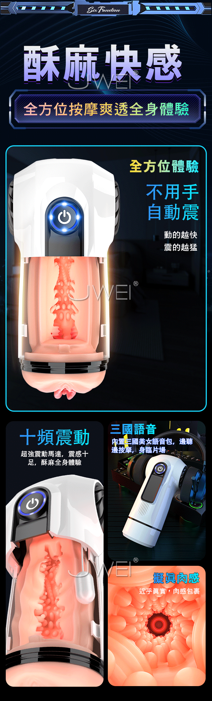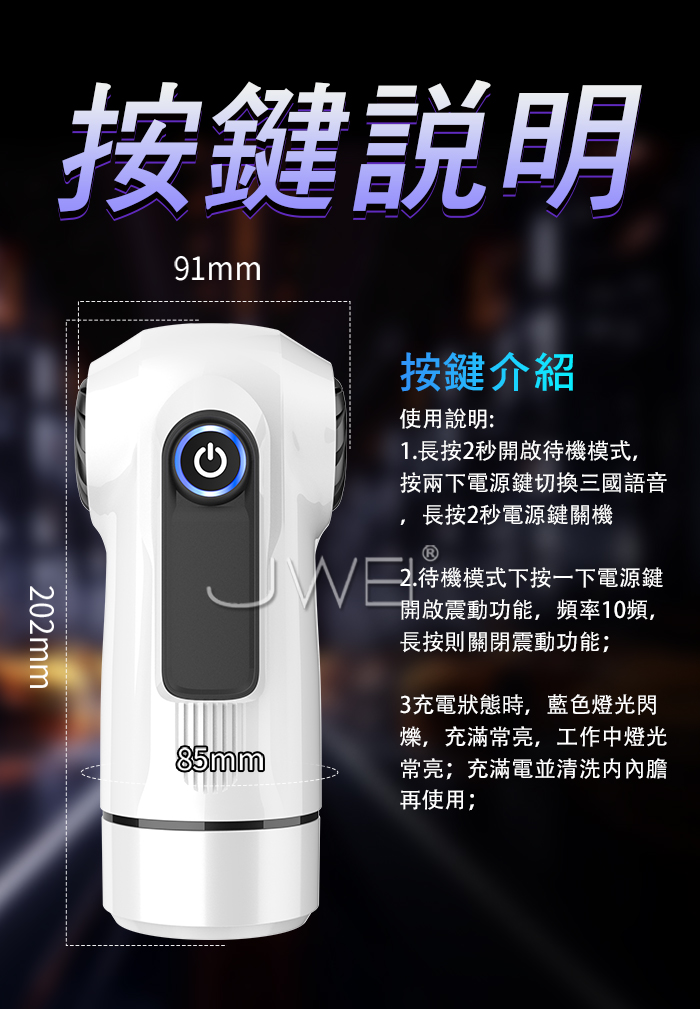 爽透全身的快感體驗 還擁有三國語音 讓你每次都可以體驗到不同的風情 物理鍛鍊 智能降低敏感度﹐讓你越練越大 產品規格 ■尺寸:大小詳如圖片標示 ■供電: USB充電 ■材質:ABS+TPE ■特色:10頻震動、三國語音