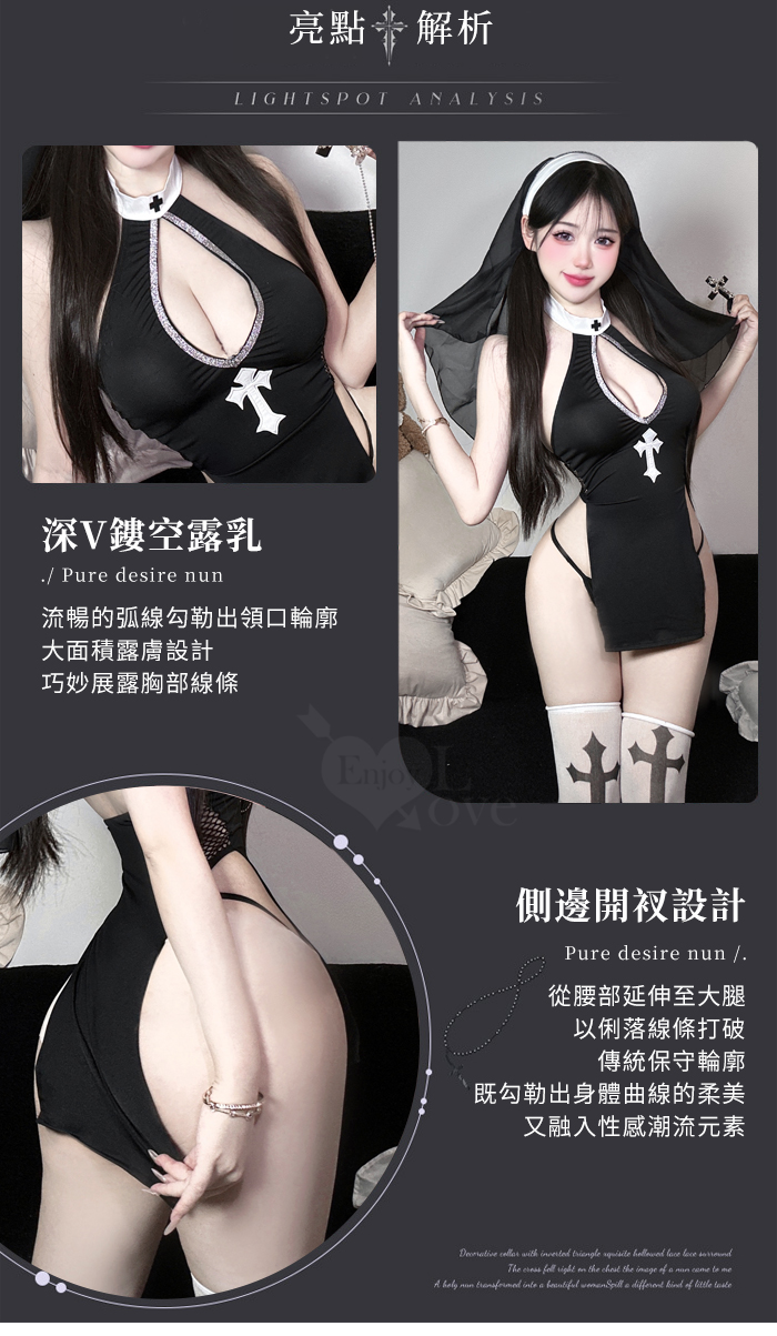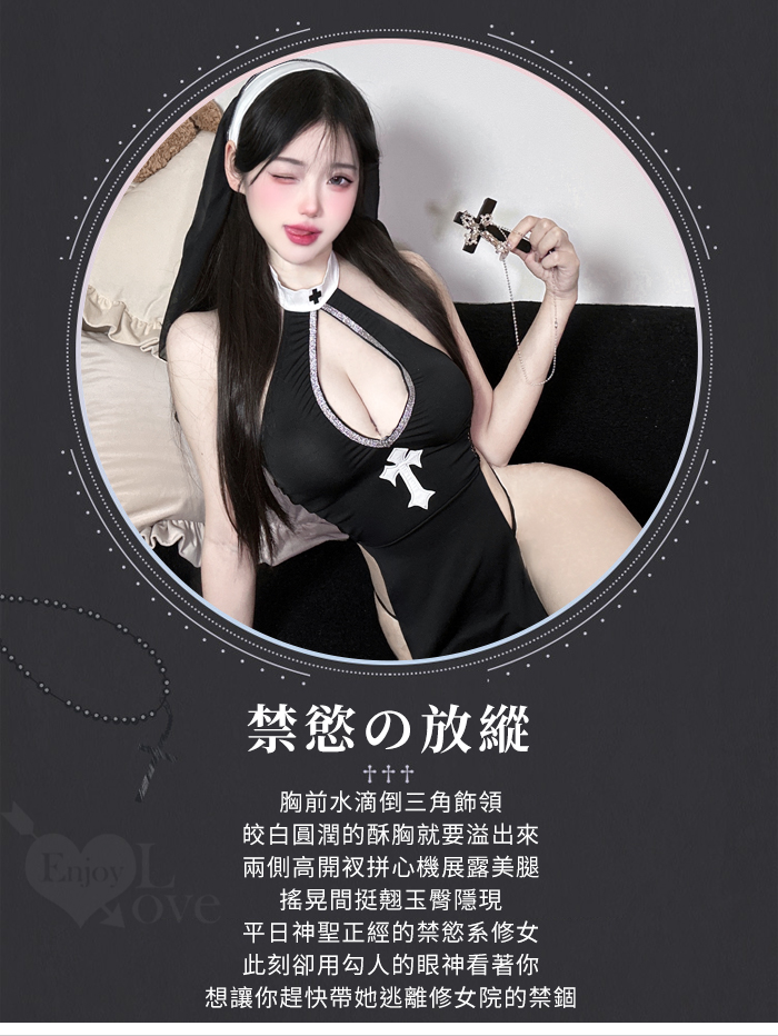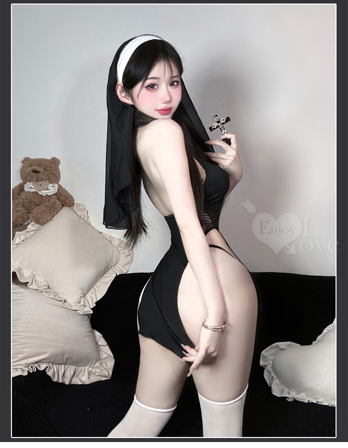 ►您現在的位置:首頁>修女角色扮演服!水滴美胸兩片式側高衩連身裙含十字絲襪四件式套裝