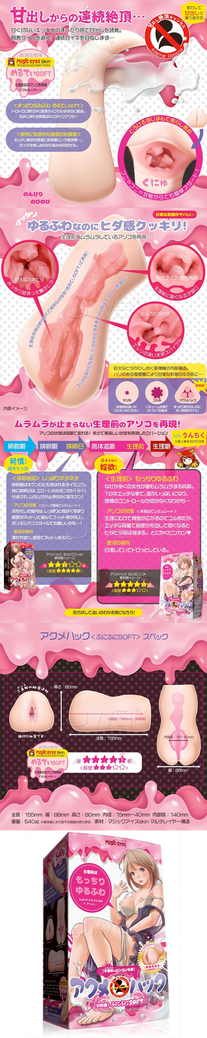 《アクメハック ねっとりフィット》 アソコの感触は生理周期で変わる!? 「〇〇日」こそ名器の瞬間。 膣内に巨大なヒダがひしめくユル系の内部構造で 「〇〇期特有のねっとり絡み付く膣壁」と 「プリプリでハリのある素肌感」をマルチレイヤーでシミュレート。 ねっとり包み込める540gの ビッグサイズボディでマッタリと愉しんでください。 ゆる系なのに密着感も凄いので、 我慢の限界に達したら「寸止め」で絶頂をキャンセルし、 限界の限界まで高めよう! キケン日だから絶対に中で出しちゃダメだよ? パッケージイラスト:緒菜穂(マジックアイズ) 陰道觸感會隨著月經週期而改變嗎? 「XX日」正是最佳時機。 Magic Eyes - 衝紅燈 黏性包裹 (アクメハック ふにふにソフト)。 陰道內部結構柔軟蓬鬆,佈滿巨大的褶皺, 多層模擬「XX時期特有的黏性緊貼的陰道壁」和「緊緻緊實的裸露肌膚」。 享受540g的包裹,享受它如黏糊糊般包裹你的感覺吧。 今天很危險,千萬別在裡面射精哦。