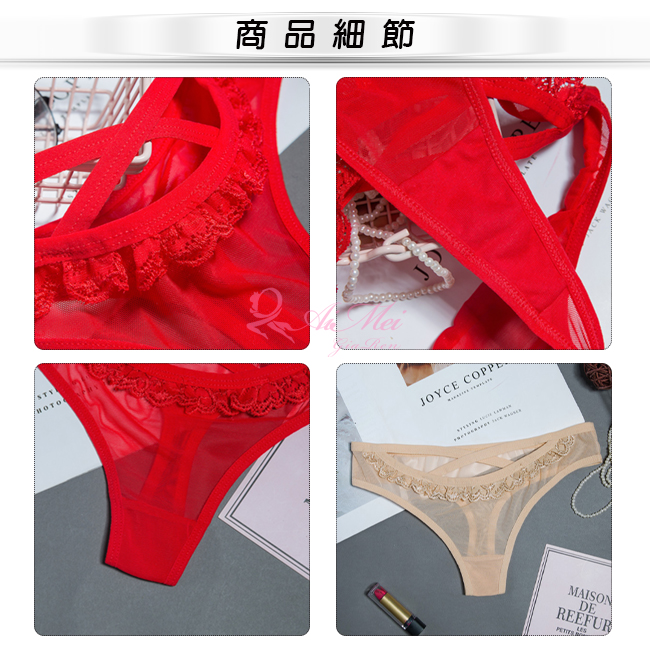 | 溫柔暗號!前交叉細帶滾邊蕾絲網紗中腰T字褲﹝膚﹞