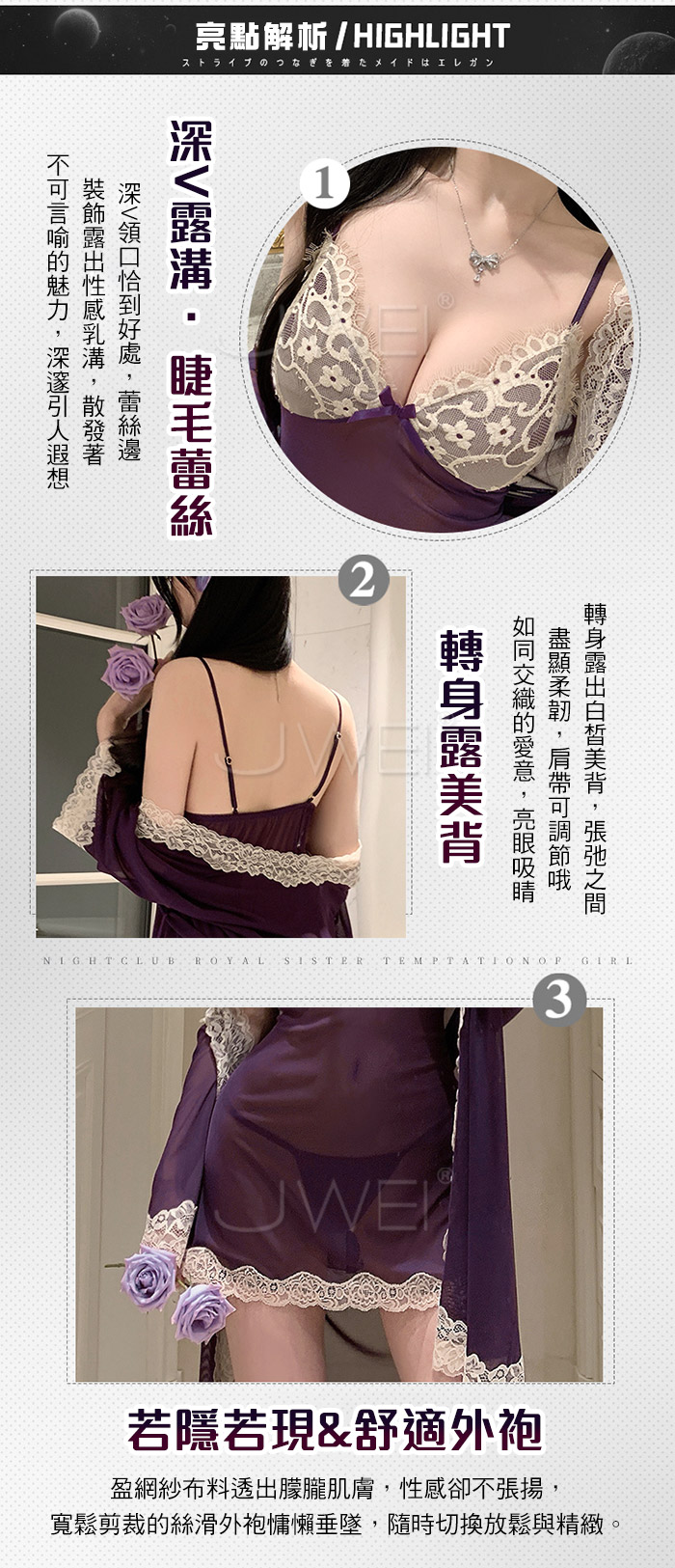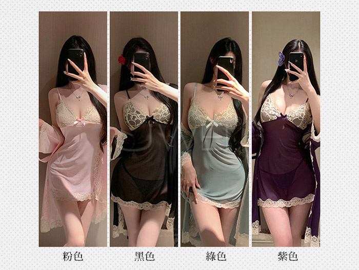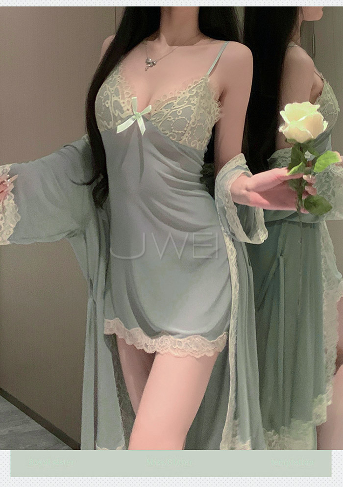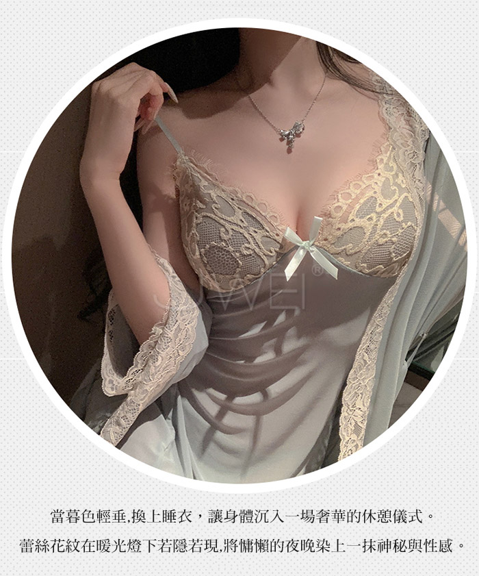 ►您現在的位置:首頁>微醺蕾絲.性感深V露溝睫毛蕾絲覆胸美背睡裙-綠色【外袍+睡裙+T褲】