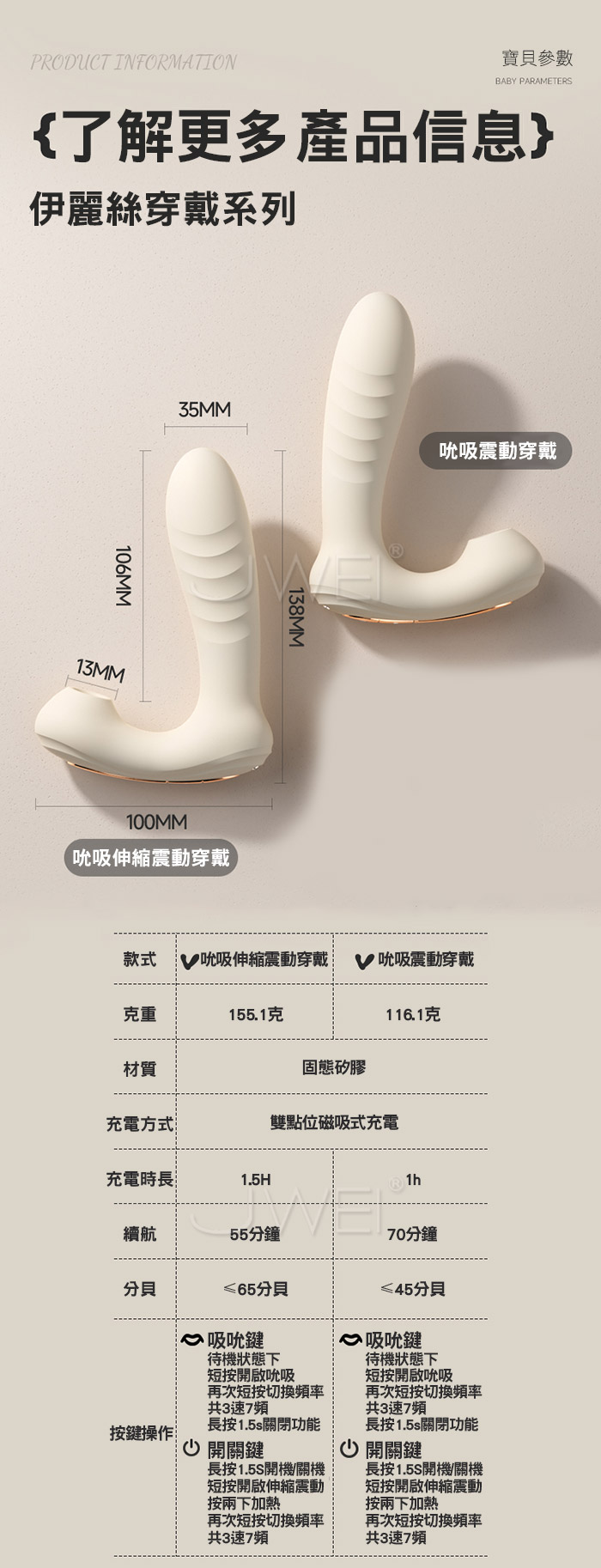 伊麗絲跳蛋,不一樣的穿戴情趣,AI男友親密互動!多樣人設滿足不同幻想~ 吮吸+震動+伸縮 三合一多功能刺激,全身酥爽!無死角貼合密道穩穩不掉落 智能升溫 告別冰冷,暖暖得更貼心,享受更溫暖的愛~ ■尺寸:大小詳如圖片標示 ■材質:矽膠+ABS ■供電:針孔充電 ■特色:10頻伸縮震動、APP智控、加溫