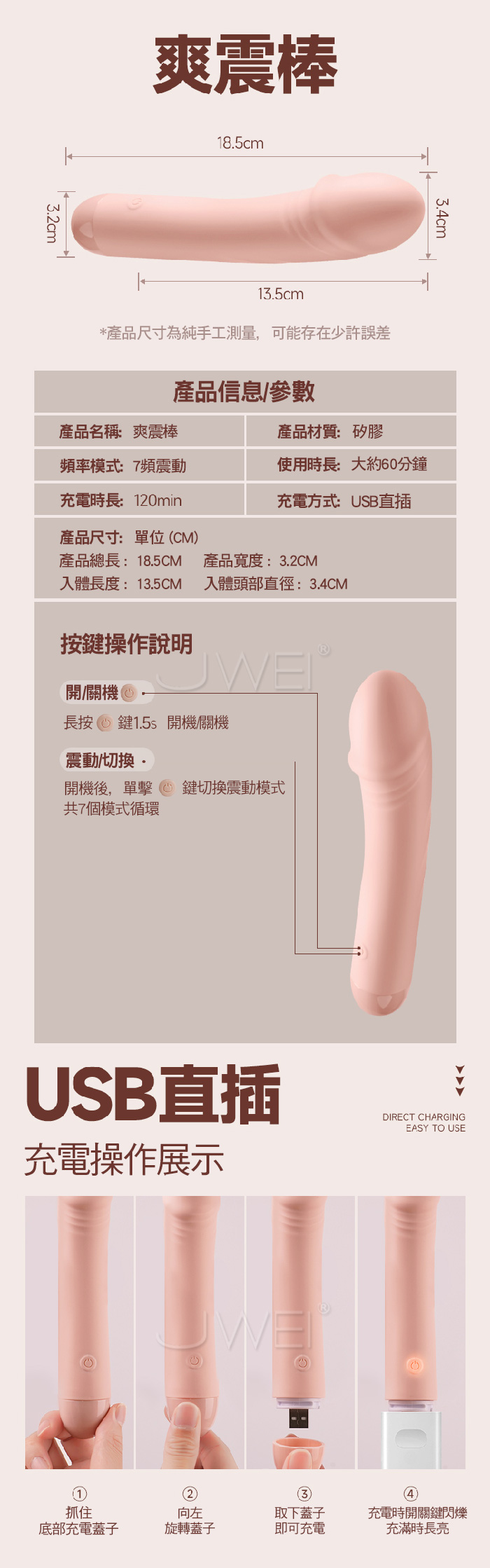| 爽震棒.7頻強震G點刺激 仿真龜頭USB直插充電按摩棒