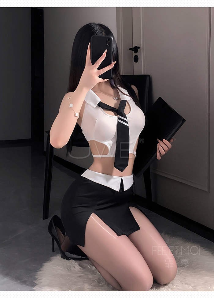 ►您現在的位置:首頁>OL領域.挖空露腰美背撞色雙開衩包臀裙OL小秘制服套裝【上衣+領帶+包臀裙+內褲】