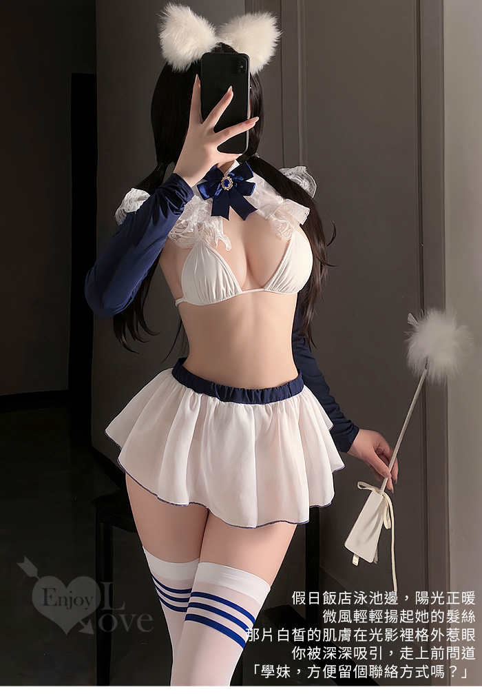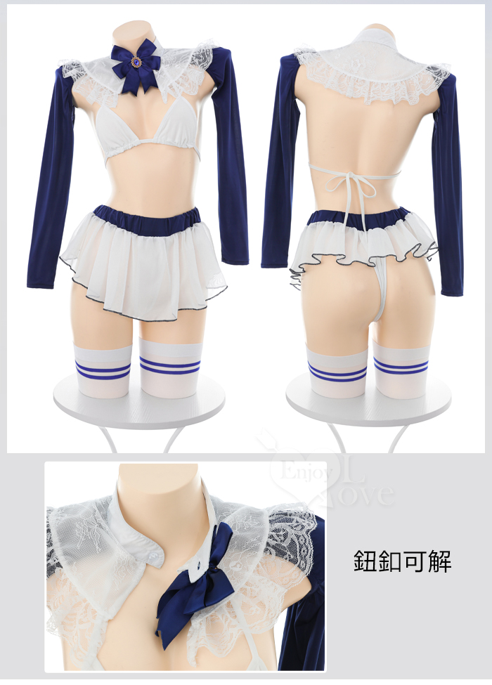 ►您現在的位置:首頁>「學院藍絲」立領花邊比基尼 × 透紗露臀小短裙 裸背含襪三件組