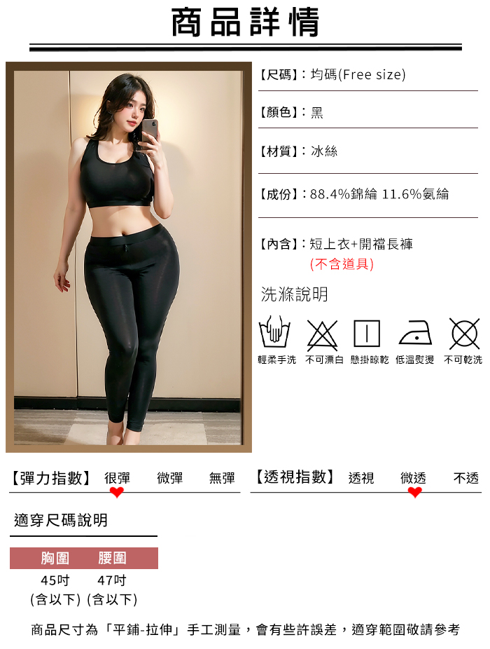 | 【棉花糖女孩】大尺碼情趣睡衣!冰絲順滑緊身小可愛 × 雙頭拉鍊免脫瑜珈褲|機能二件組﹝黑﹞
