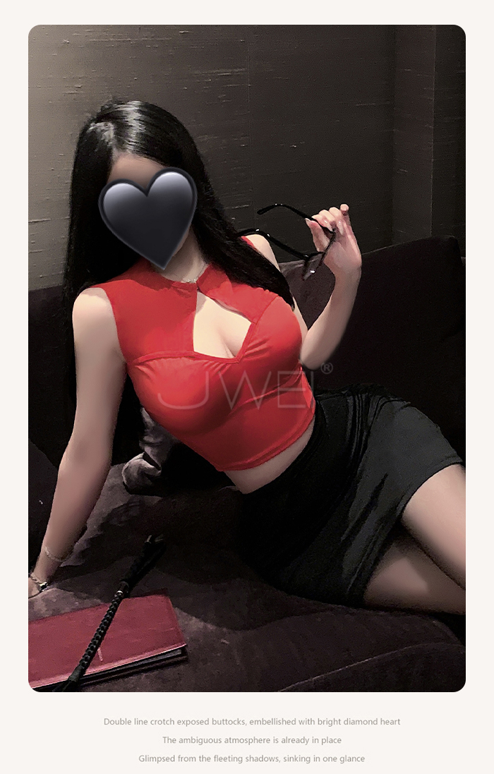 ►您現在的位置:首頁>繆斯秘語.胸前挖空露溝貼身包臀超短裙擺秘書裝【T褲+紅上衣+黑裙】