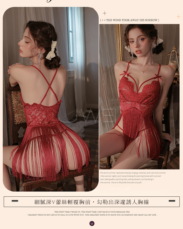 ►您現在的位置:首頁>輕舞搖曳.網眼蕾絲深V誘惑流蘇裙襬露臀睡裙【睡裙+T褲】酒紅